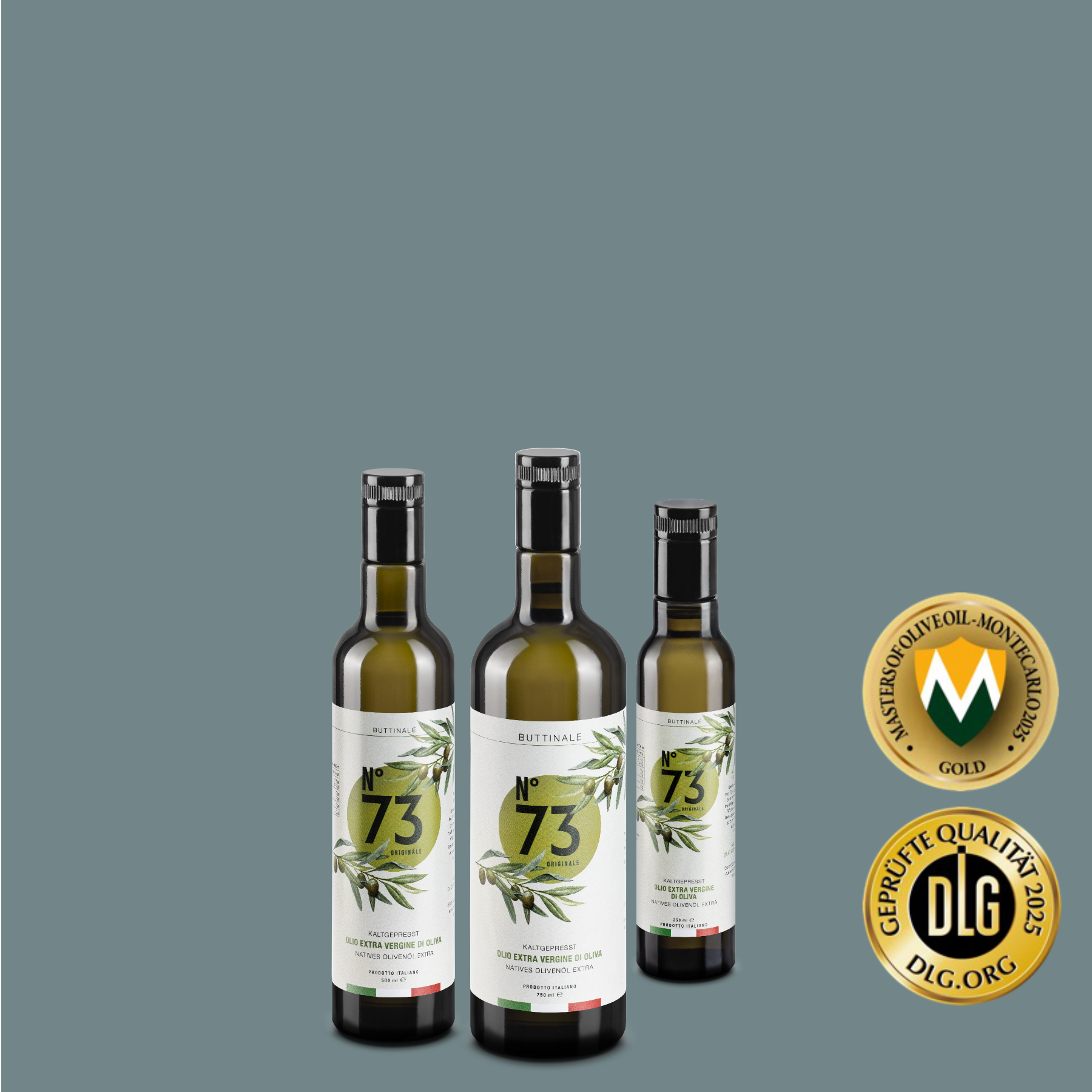 Die Olivenöle von BUTTINALE 73 halten auch dem Urteil der besten Geschmacksexperten stand. Nach Gold und Silber für drei Produkte 2024, wurden wir im Mai 2025 mit einem wahren Medaillenregen bedacht. 1 x PLATIN, 7 x GOLD bei den MASTERS OF OLIVE OIL in Monte Carlo 2025. Und auch die DLG bewertete unser Manufaktur-Öl und unser NO. 73 in Punkto Qualität mit Gold.